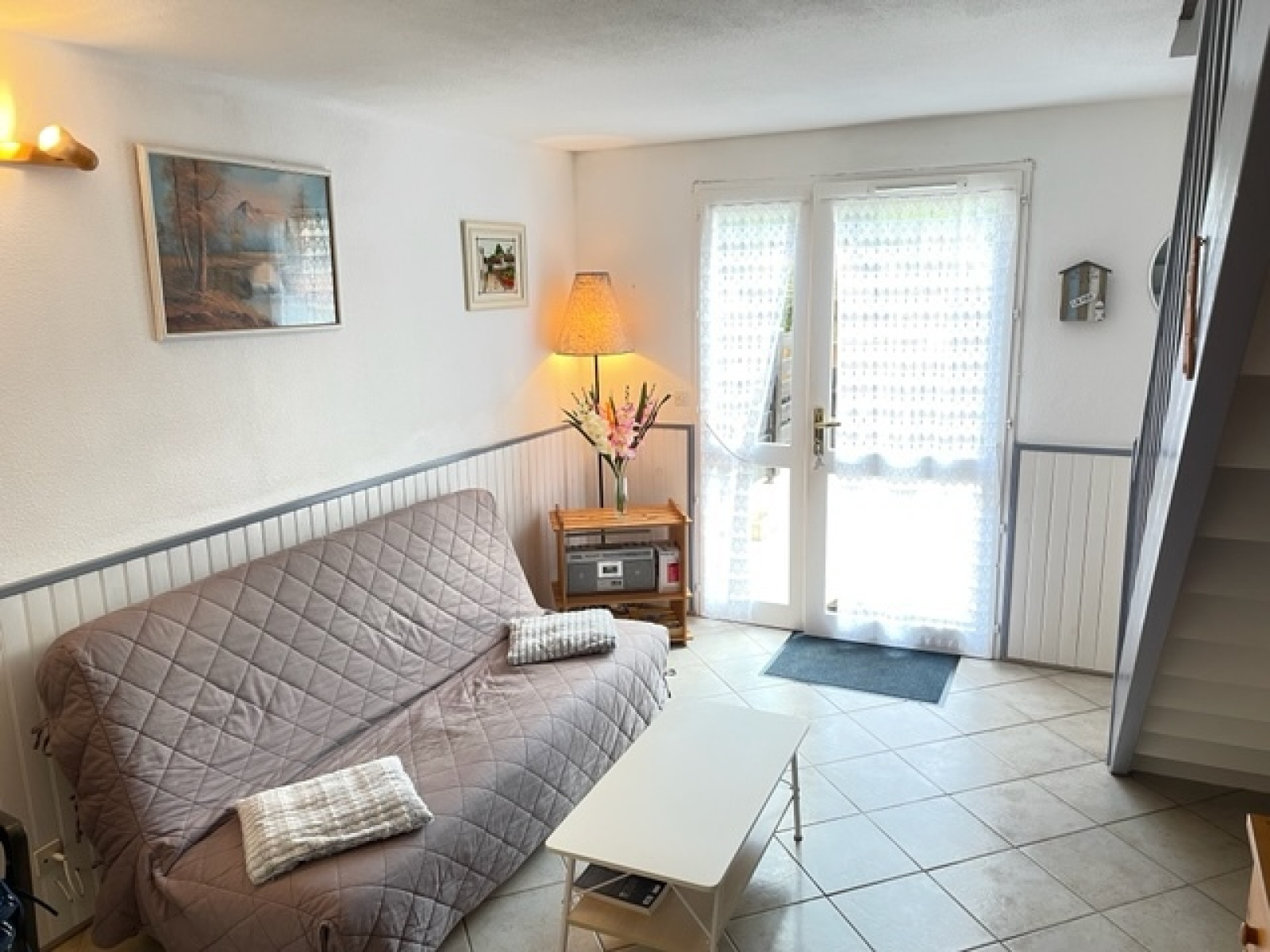 Sur 2 niveaux comprenant un séjour et un coin cuisine ouverte ensoleillée, sur terrasse avec cellier.