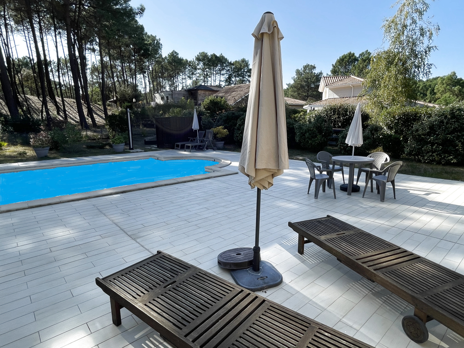 Une loggia de 15 m² située devant la cuisine, une terrasse carrelée autour de la piscine 5/10 avec 100 m² de terrasse