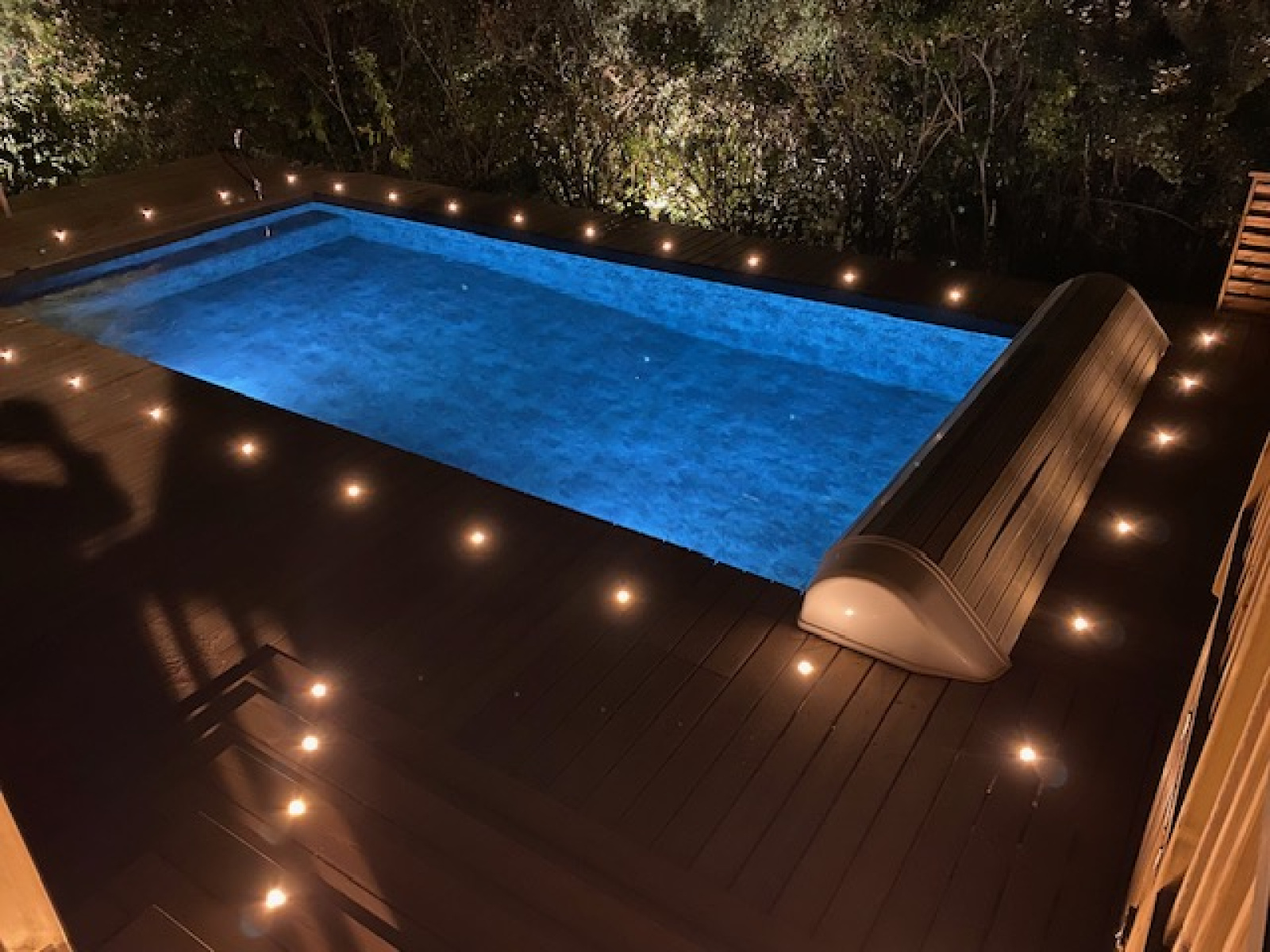 100 m² de terrasse, piscine chauffée par une pompe à chaleur, haut parleur aquatique, liner armé.