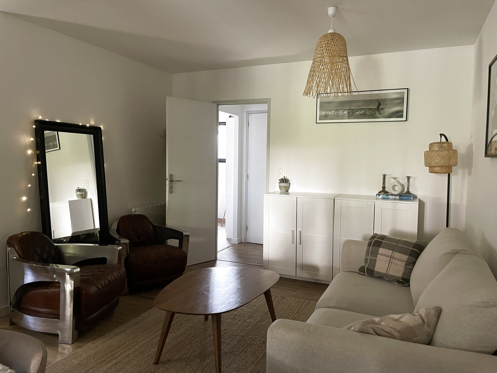 Comprenant un grand séjour avec un coin cuisine donnant sur une terrasse couverte et sur un petit jardin d'angle de 40 m², une grande chambre (divisible en 2 chambres)
