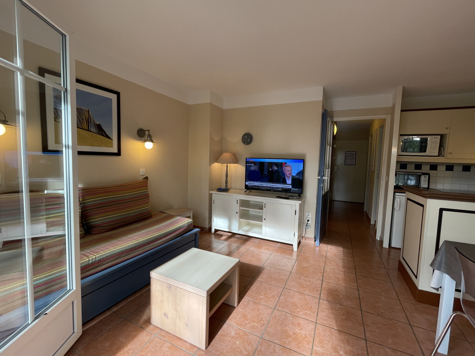 Séjour avec coin cuisine donnant vers le balcon ensoleillé