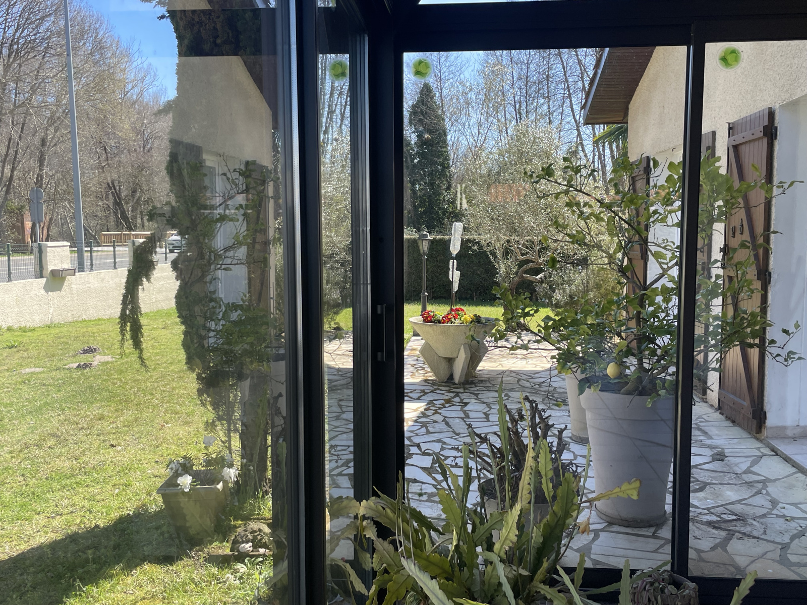 Une véranda sur la façade rue d'une surface de 28 m² en double vitrage.