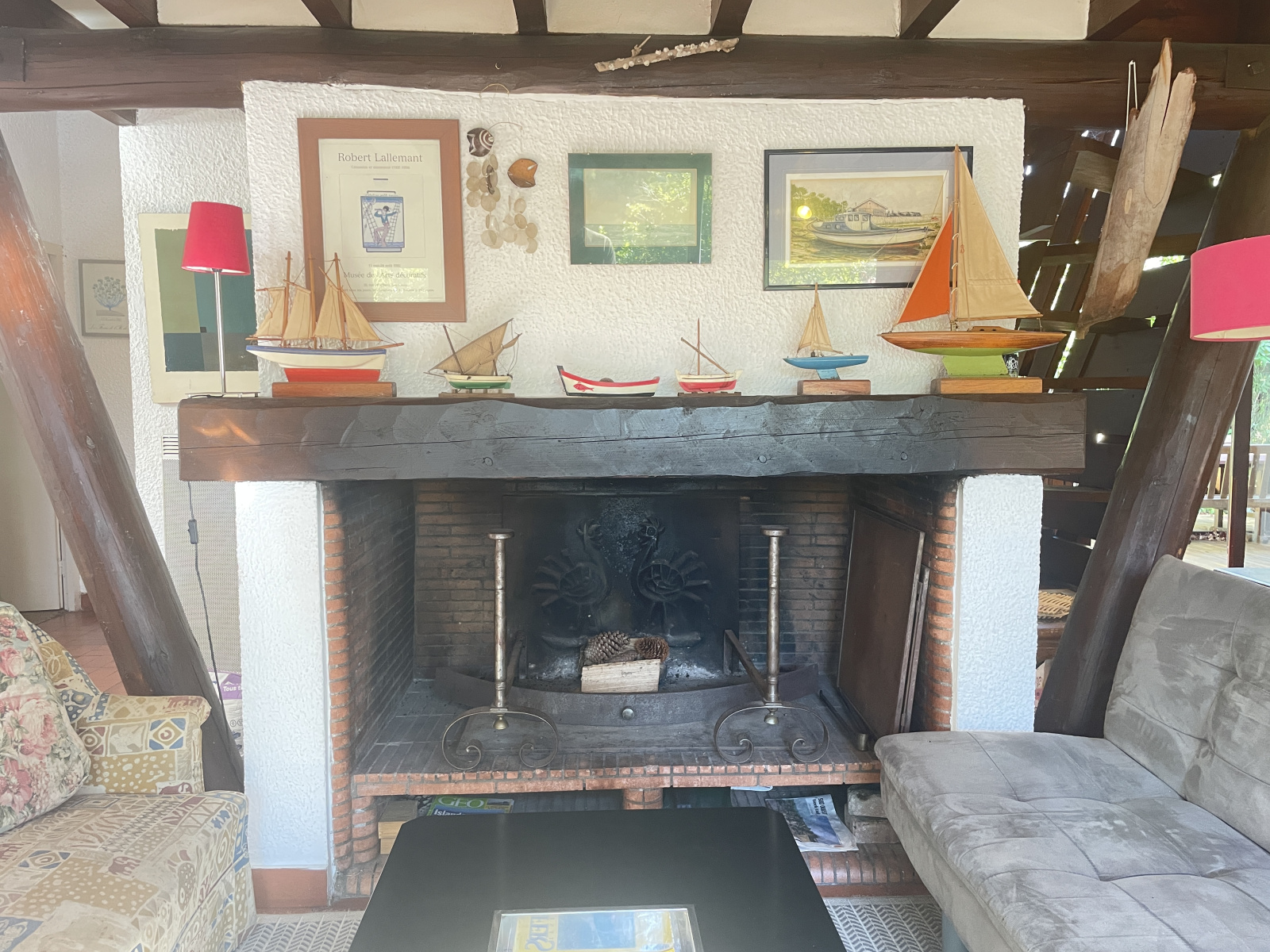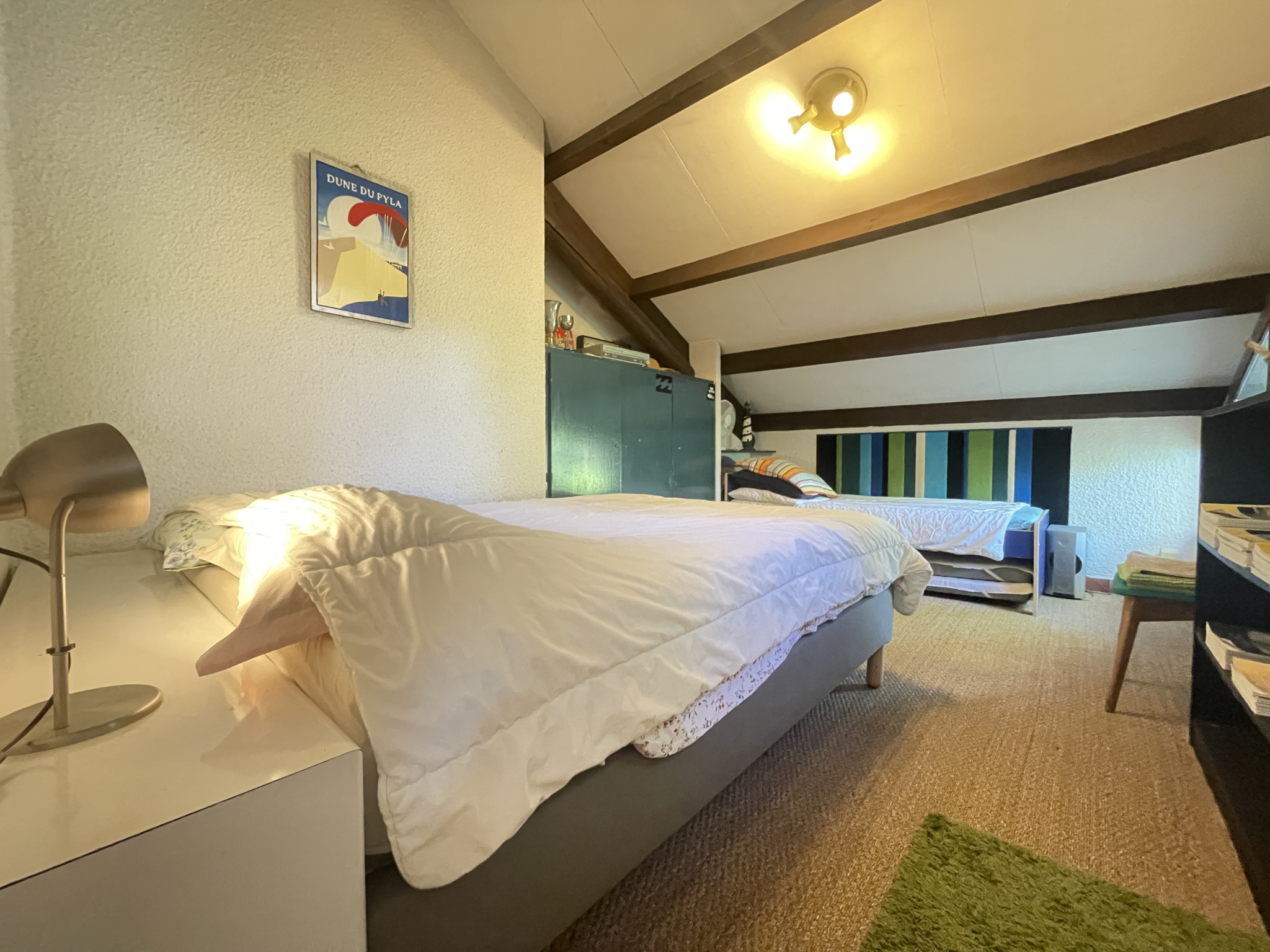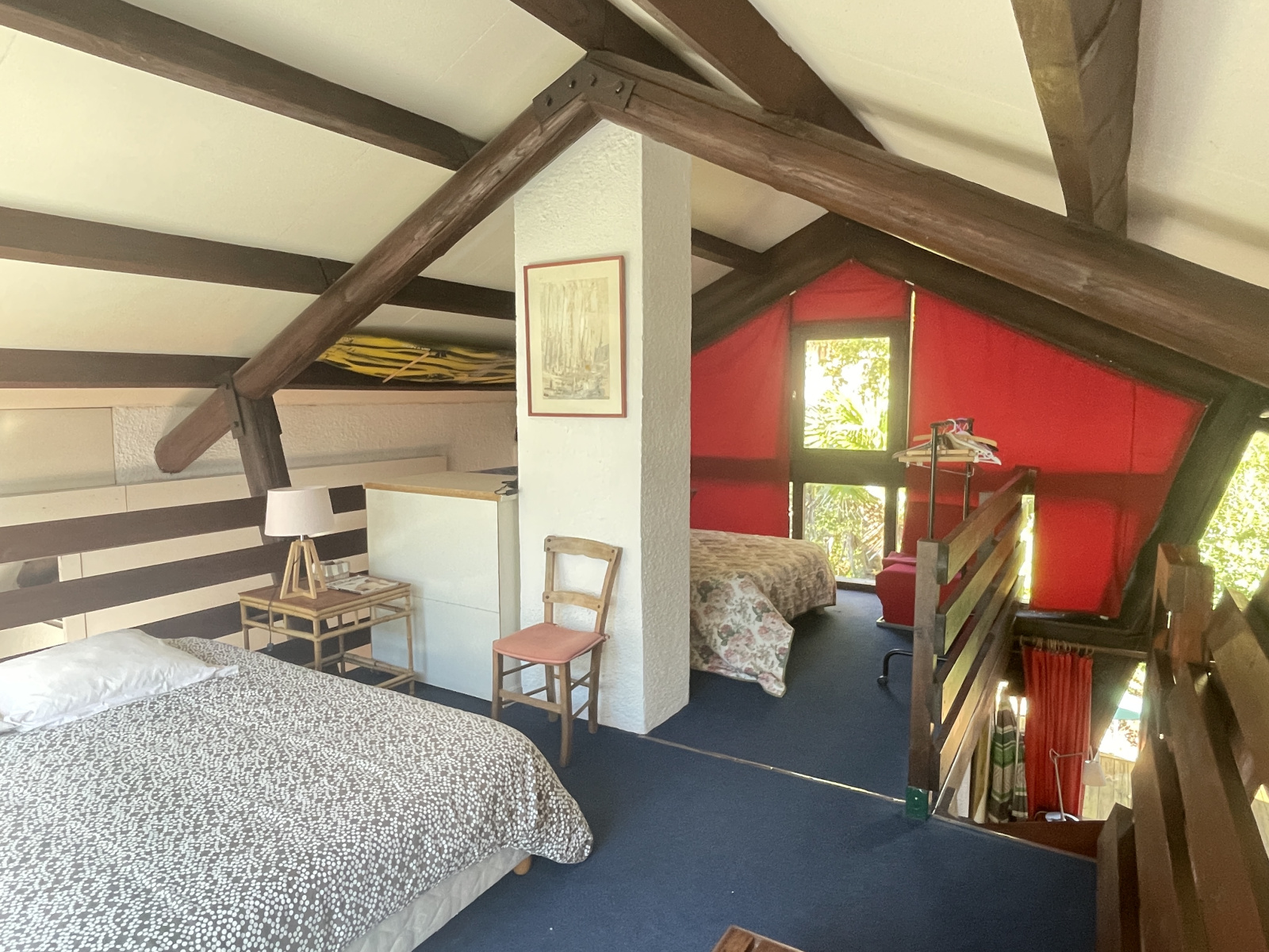 Deux chambres s'insèrent aisément dans une des parties basses du toit, l'autre partie ouverte sur les deux flancs offre un vaste séjour avec une cheminée une cuisine et une troisième chambre.