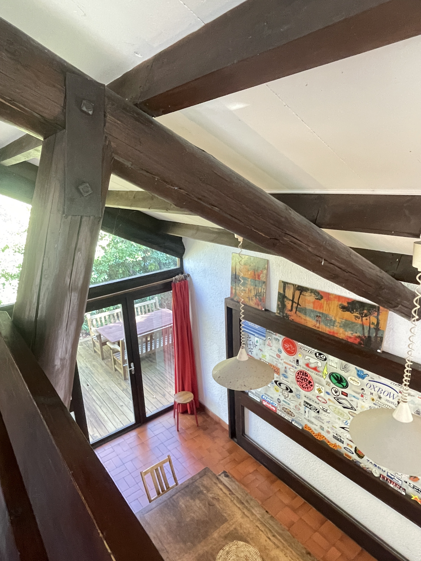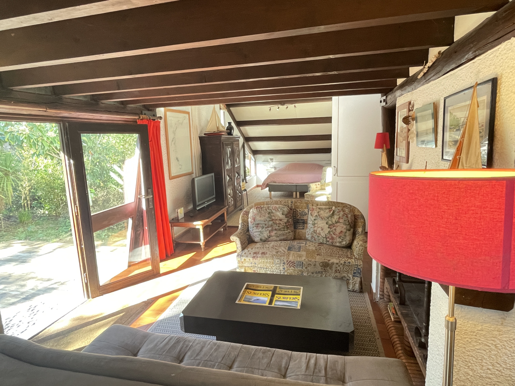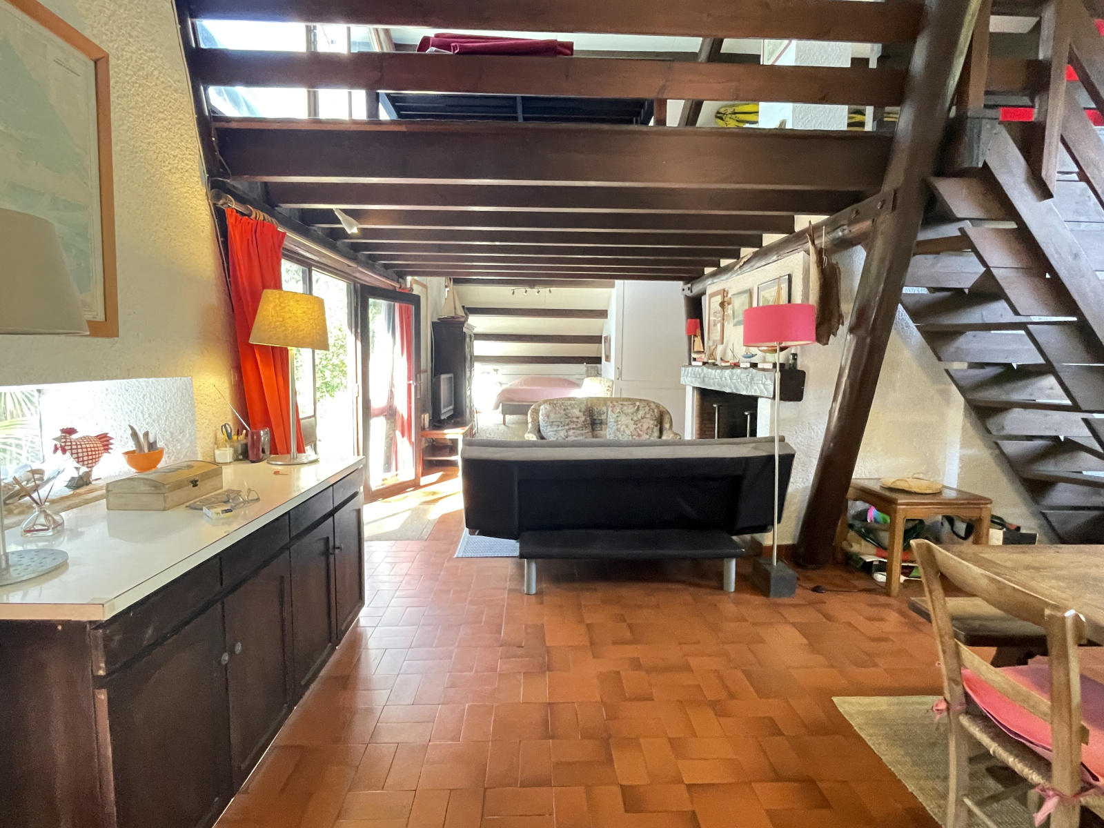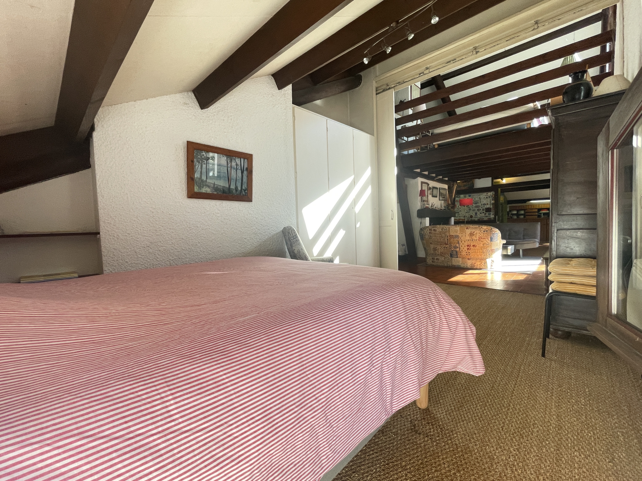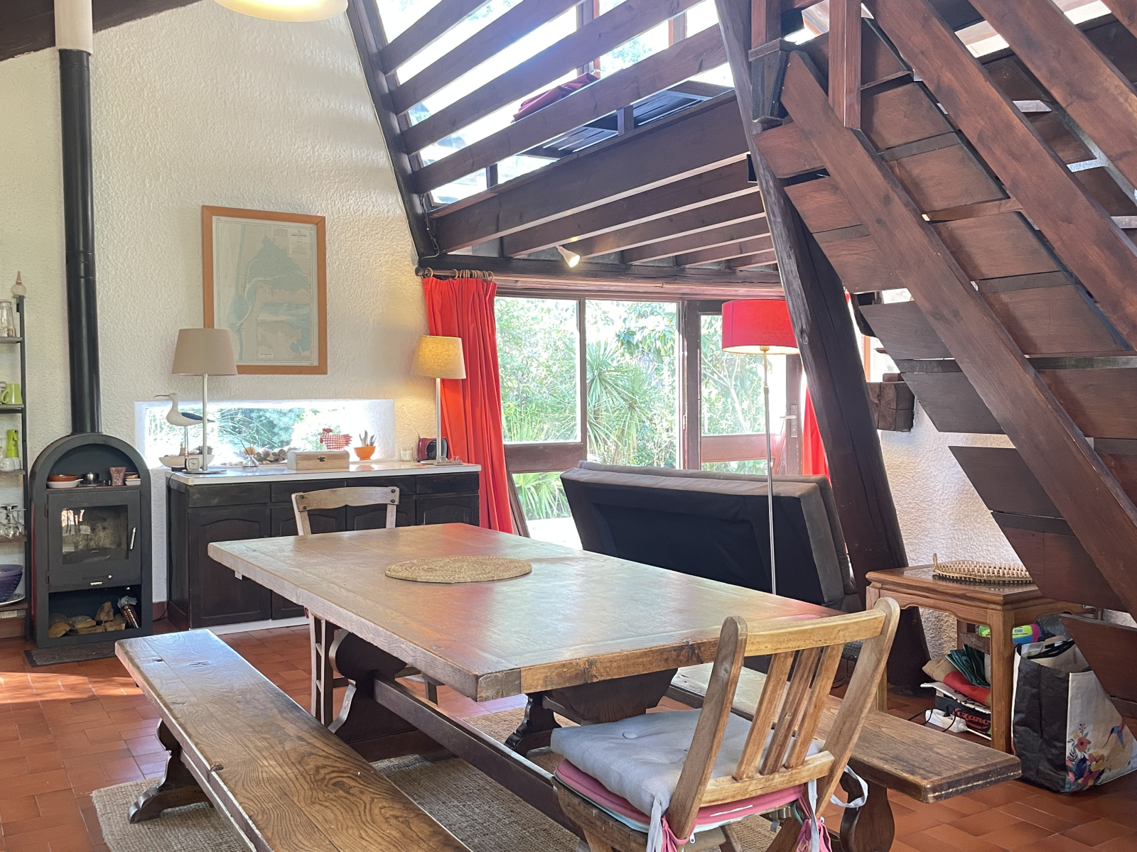Le séjour s'éléve jusqu'au faîtage qui est agrémenté d'une mezzanine ouverte de tous côtés déterminant naturellement les differentes vocations de cette grande pièce (chambre, coin lecture, salle de jeux)
