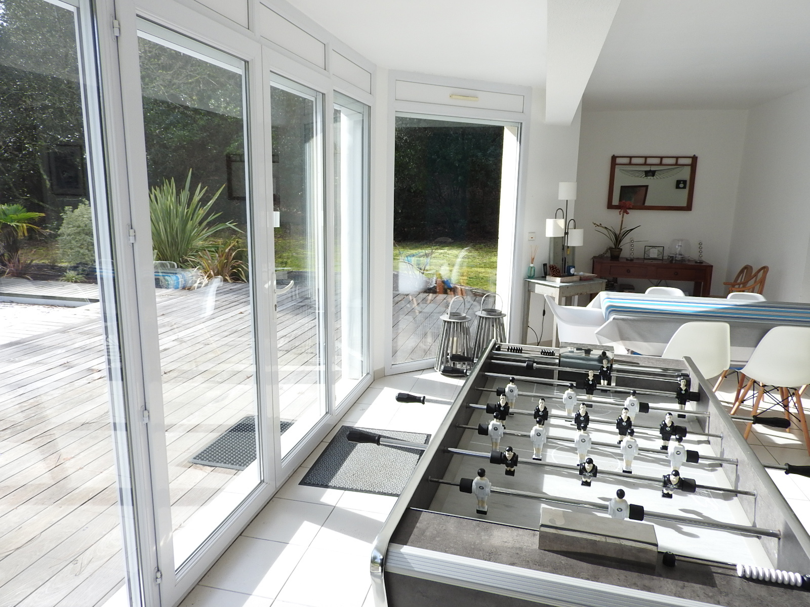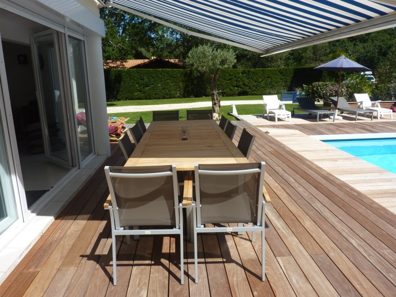un grand salon séjour ensolleillé donnant sur la piscine avec terrasse en bois de 100 m².