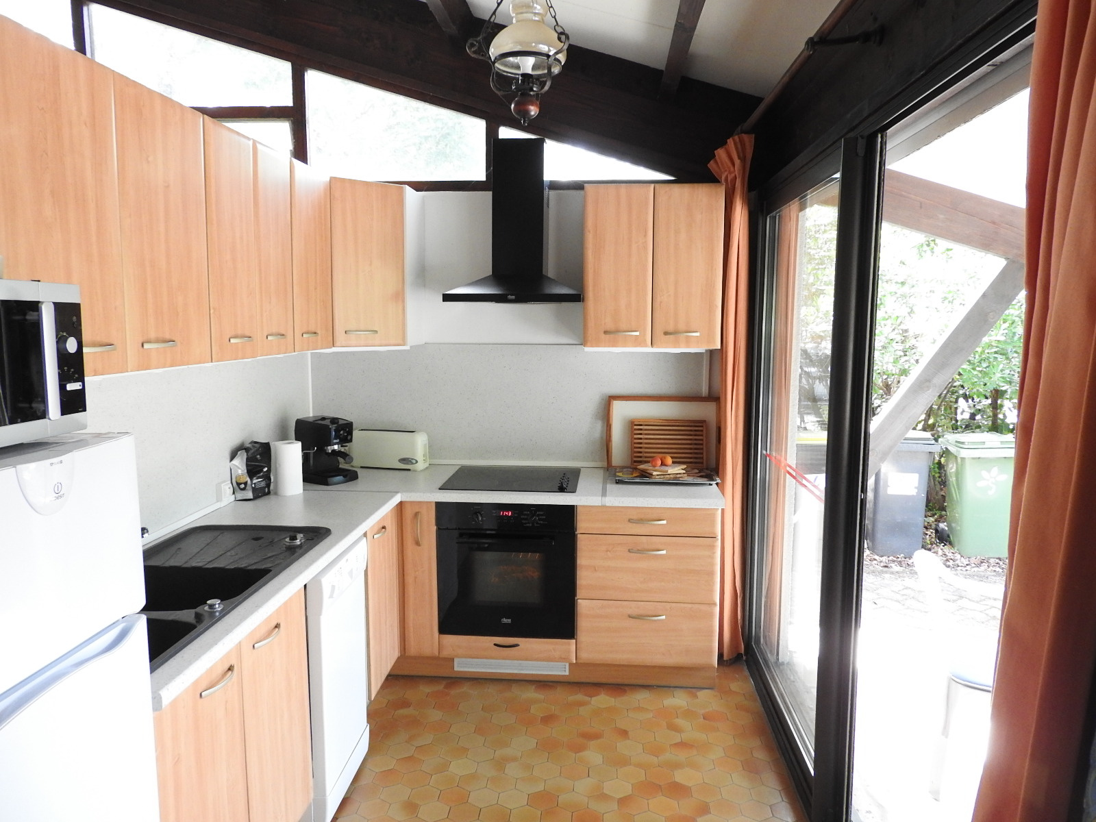 Une cuisine ouverte meublée et équipée