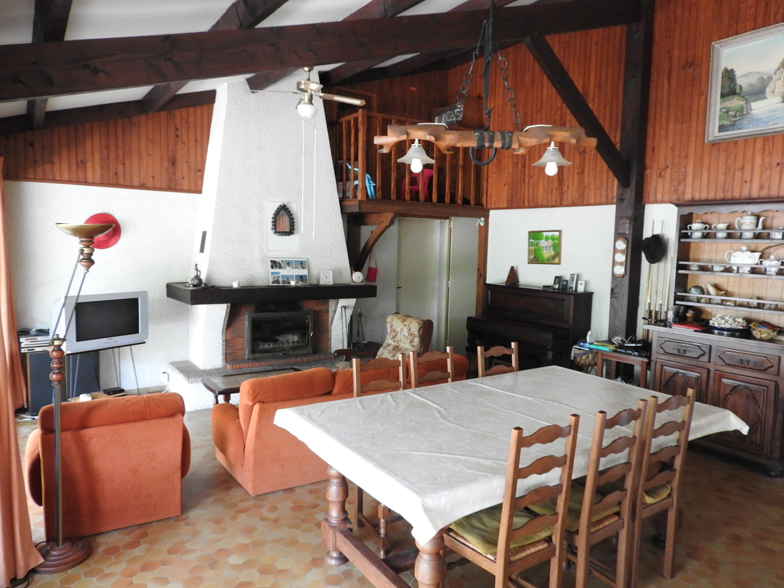 Un grand salon séjour avec cheminée insert